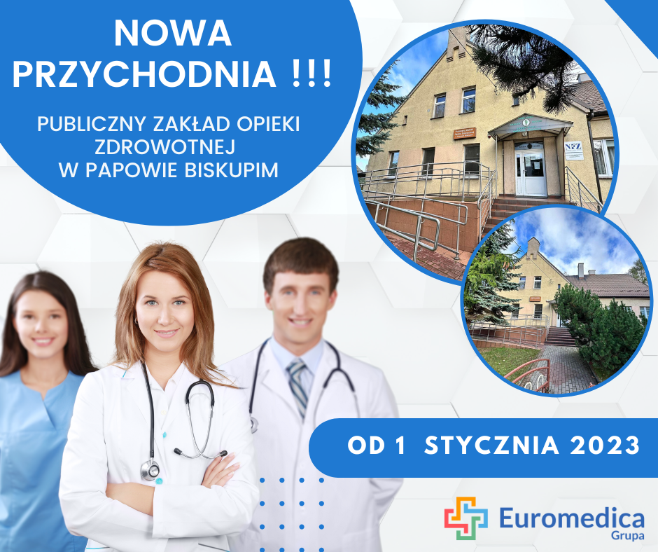 z przyjemnością informujemy, iż od 1 stycznia 2023r. uruchamiamy BEZPŁATNĄ PRZYCHODNIĘ (funkcjonującą obecnie jako Publiczny Zakład Opieki Zdrowotnej w Papowie Biskupim) pod szyldem EUROMEDICA.
